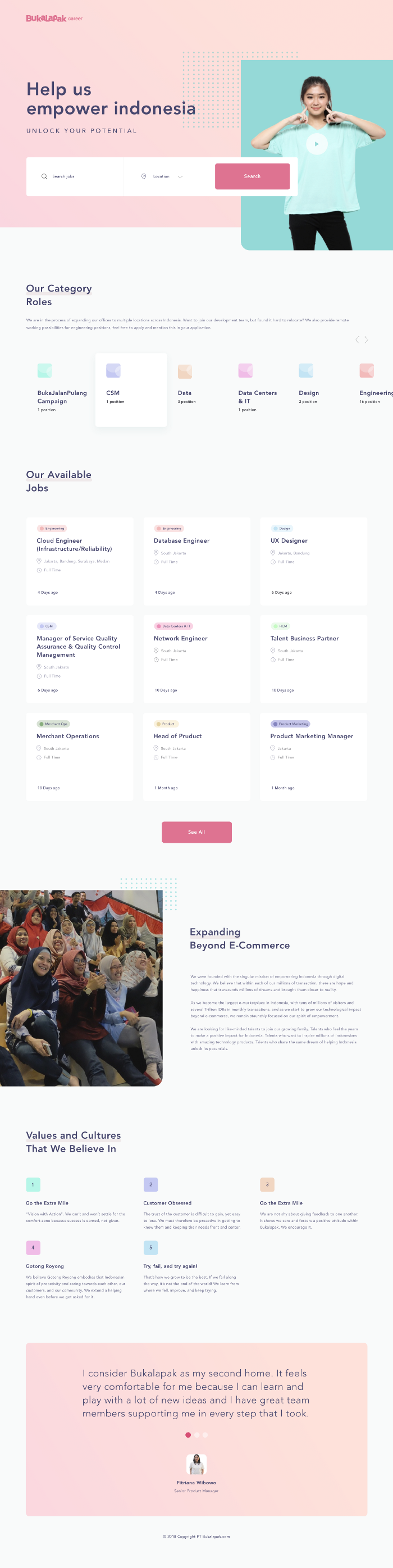 Bukalapak is a unicorn and one of the largest e-commerce company in Indonesia. Founded by Achmad Zaky, Nugroho Herucahyono and Fajrin Rasyid in 2010, Bukalapak initially started as an online marketplace to enable small medium enterprise go online. The company expands into many areas beyond its origins, including online-to-offline solution by empowering traditional mom-and-pop stores called warung as its partners. As of 2019, the company has more than 4.5 million SME sellers, 70 million monthly active users, 1.9 million warung partners, and averaging two million transactions per day.A lot of people specially for millenials wants to working on bukalapak, and they have career site. You can check online in here https://careers.bukalapak.com/ , and it’s preview current site (Friday, 27 September 2019).